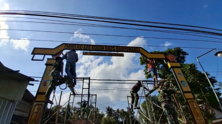 BANYUWANGI – Di tengah semangat perayaan Hari Ulang Tahun (HUT) ke-80 Kemerdekaan Republik Indonesia, Satuan Tugas (Satgas) TNI Manunggal Membangun Desa (TMMD) ke-125 Kodim 0825/Banyuwangi menunjukkan dedikasi nyata dengan melaksanakan pemasangan gapura di jalan menuju jembatan Desa Kesilir, Kecamatan Siliragung, Minggu (17/8/2025).