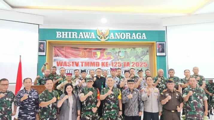 Banyuwangi – Kamis (07/08/2025), Kodim 0825/Banyuwangi menerima kunjungan Tim Pengawas dan Evaluasi (Wasev) TMMD ke-125 TA 2025 bertempat di Aula Makodim 0825 Jl. R.A. Kartini, Banyuwangi. Kegiatan ini dipimpin oleh Katim Wasev Brigjen TNI (Mar) Werijon, M.Han., yang juga menjabat sebagai Waaspotmar Kasal. Kegiatan berlangsung dari pukul 08.17 WIB hingga 09.13 WIB dan dihadiri oleh unsur Forkopimda,Kepala SKPD terkait, jajaran TNI/Polri, serta sejumlah pejabat Pemkab Banyuwangi.