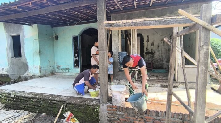 Di depan rumah yang tengah direnovasi, Muklis menyaksikan dengan haru perubahan rumahnya. Dinding yang dulu retak kini sudah diplester rapi, kusen pintu terpasang kokoh, dan teras mulai rata dengan semen segar. Program RTLH TMMD Ke-127 hampir selesai.