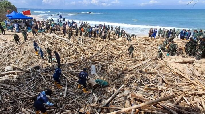 Sinergi Tanpa Batas TNI dan Warga ‘Geruduk’ Pantai Pancur Bersihkan Sampah Kayu
