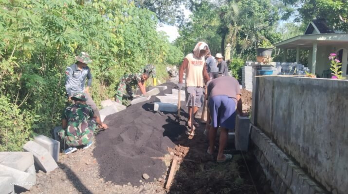 Kondisi cuaca yang cerah menjadi penyemangat tersendiri bagi personel Kodim 0820/Probolinggo dalam melaksanakan kegiatan pembangunan pemasangan paving di Dusun Klading, Desa Maron, Kabupaten Probolinggo.