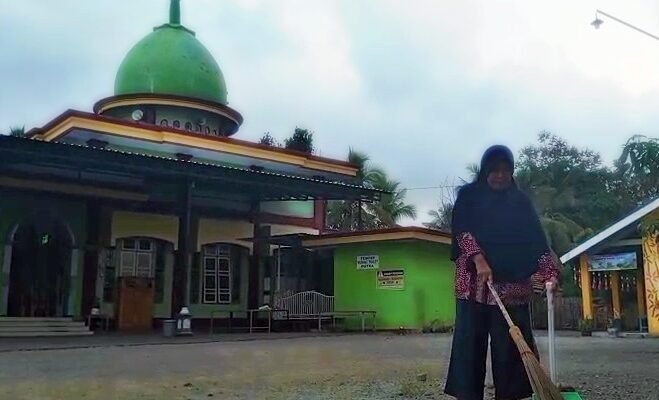 Matanya tertuju ke beberapa sampah yang bertaburan di halaman samping masjid. Memerangi sampah inilah tujuan target mata tajam lansia tersebut. Tak ada satu kata pun dalam bekerja, keheningan ia bekerja, hanya suara sapu dan serok yang terdengar di subuh hari itu sekitar pukul tiga pagi.