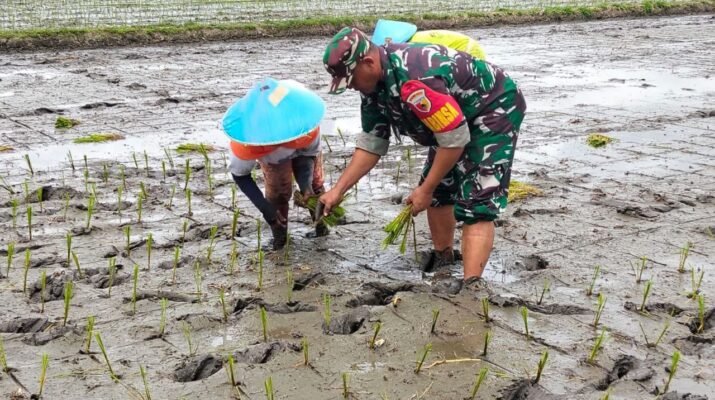 Rogojampi – Babinsa Desa Pengatigan, Sertu I Ketut Gede Wiradnyana, melaksanakan kegiatan pendampingan tanam padi bersama Kelompok Tani Daun Kelor di Desa Pengatigan, Kecamatan
